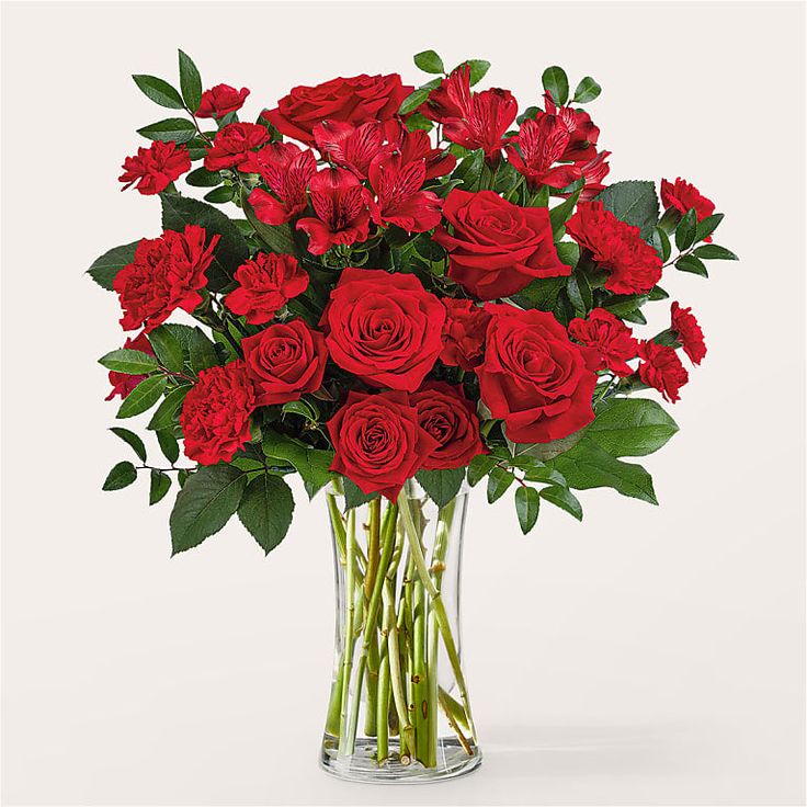 A rich mix of all-red blooms artfully arranged in a clear glass vase. Designed for Valentine’s Day, this arrangement celebrates love, passion, and bold romance.