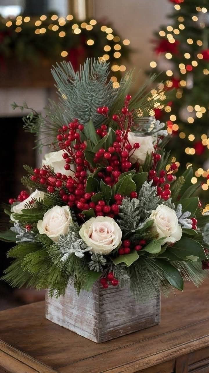 A rustic wooden box filled with elegant white roses, bright red berries, and fresh winter greens — a beautiful blend of simplicity and seasonal charm. This arrangement brings a touch of winter magic indoors, perfect for gifting or adding a cozy festive accent to your home décor.