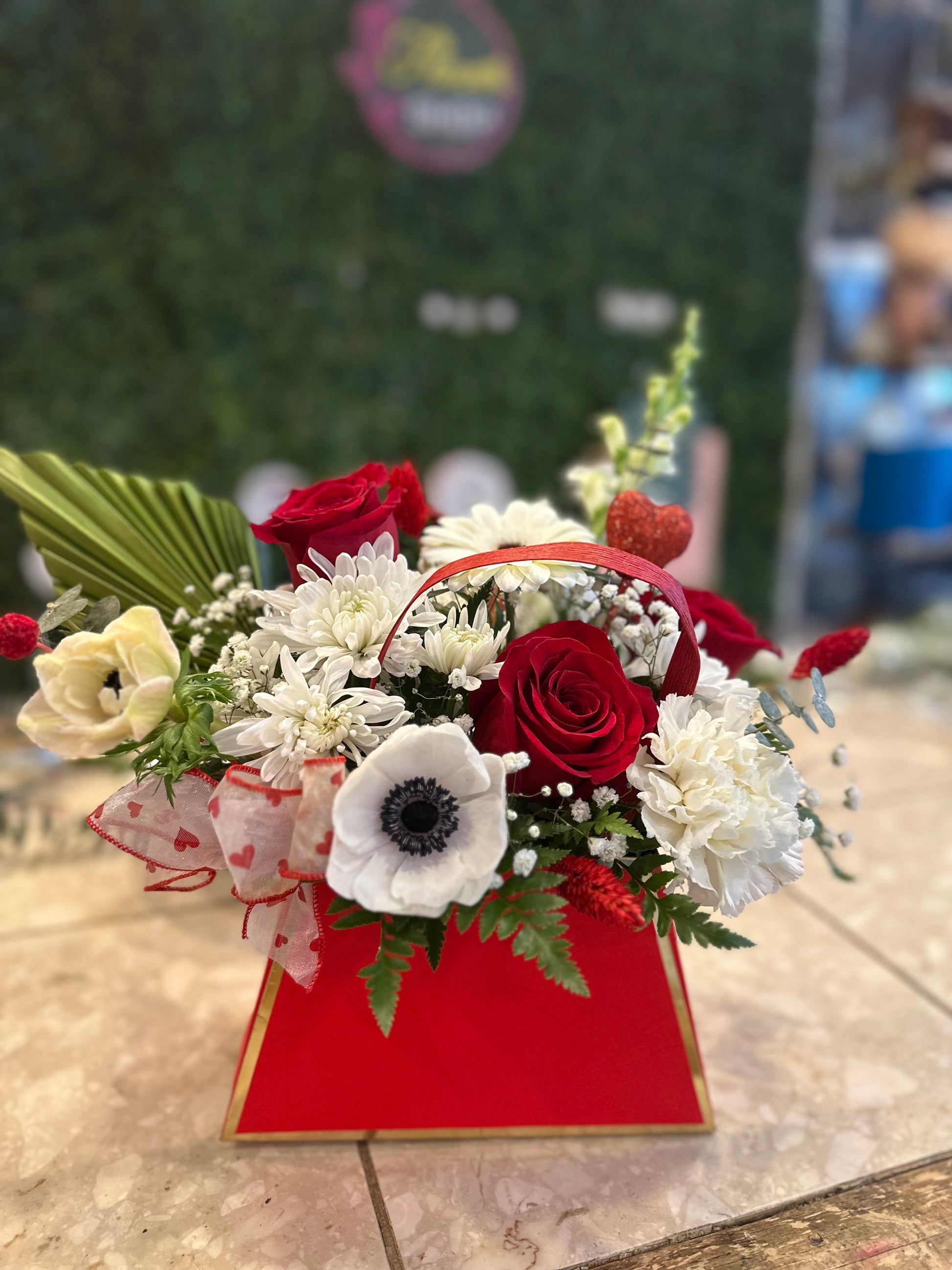 A stylish Valentine’s Day arrangement featuring romantic blooms designed in a bold red purse. A unique and fashionable way to celebrate love.